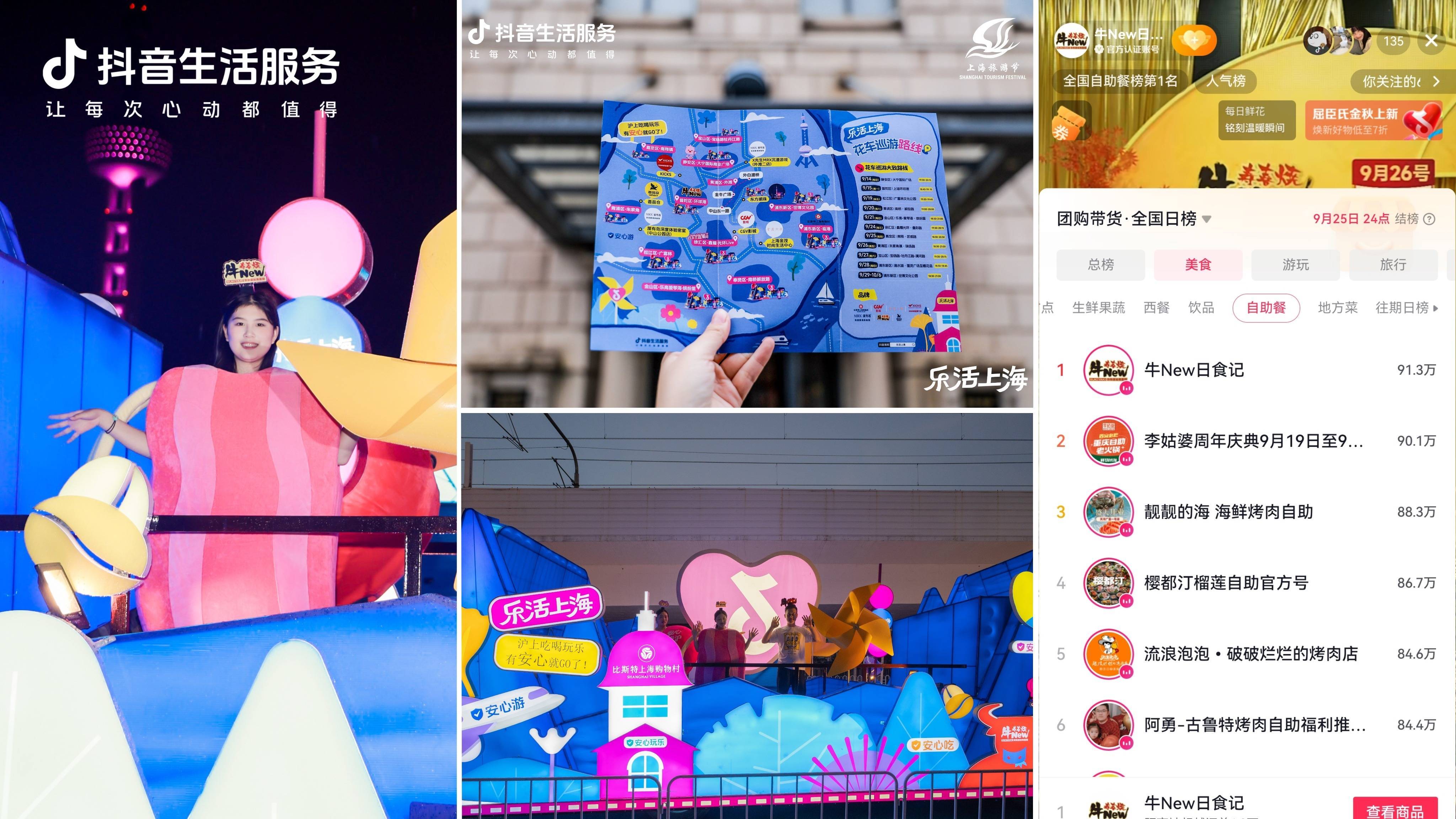 抖音生活服务积极响应「上海之夏」、「上海旅游节」等上海市年度重点活动,将平台长线城市IP#乐活上海 与“上海旅游节花车巡游”、“黄圣依上海行”、“ZANMANG LOOPY魔都环游记”等优质内容深度联动。为平台用户供给丰富活动内容的同时,紧密携手牛New寿喜烧等本地品质商家,通过提供上海特色优惠团购商品,深度融合“上海旅游节花车巡游”打造具有浓郁上海特色的商圈路线。