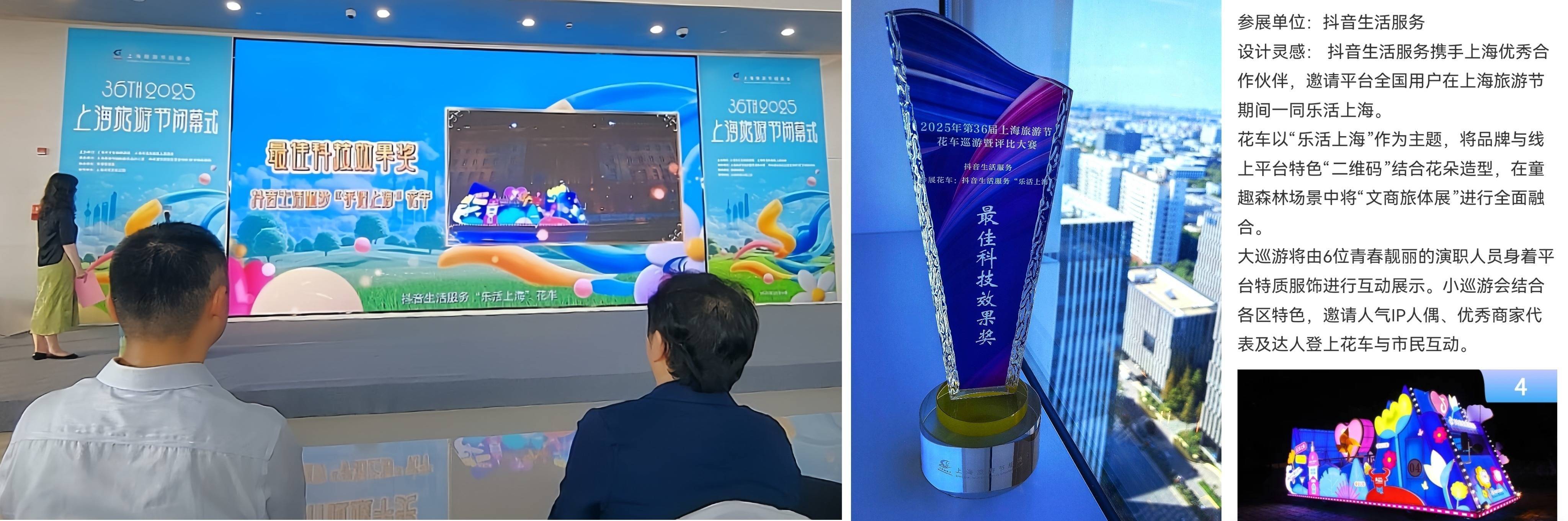 r10月6日,2025年第36届上海旅游节闭幕式新闻发布会在世博文化公园温室花园举行,抖音生活服务“乐活上海”花车荣获最佳科技效果奖。