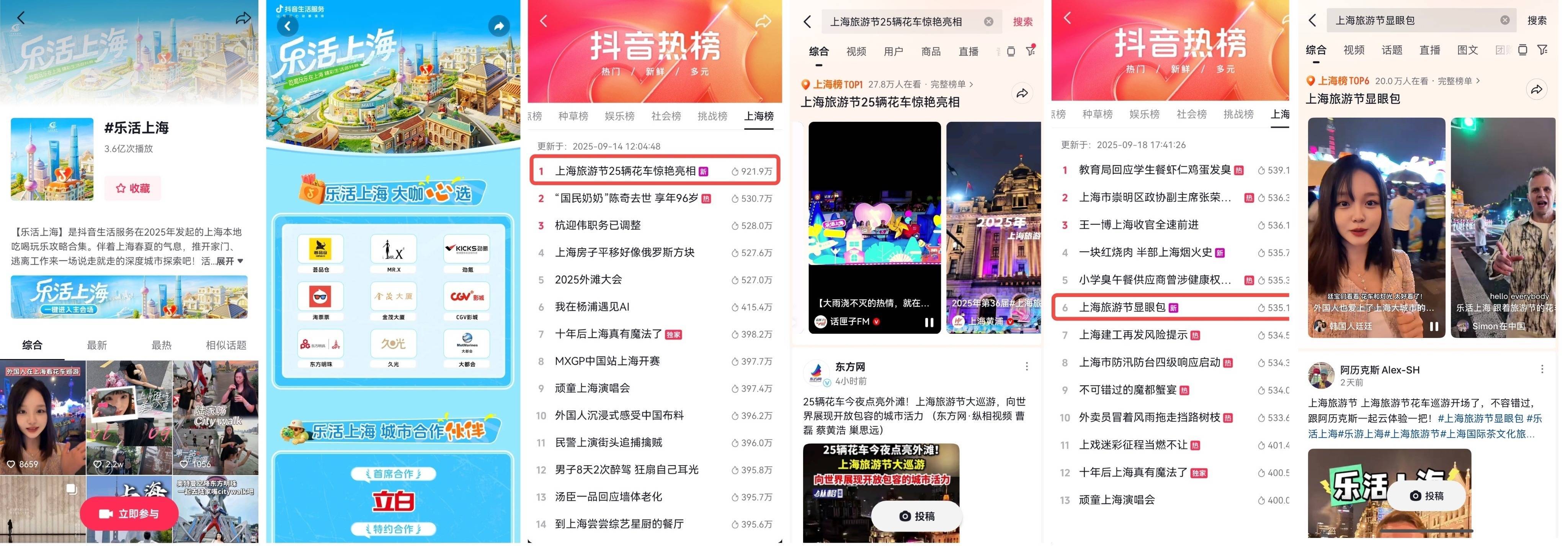 在抖音端,#乐活上海 线上话题总体曝光超3.6亿,“上海旅游节25辆花车惊艳亮相”热点登上同城榜Top1,“上海旅游节显眼包”登上同城榜Top6并持续在榜一周,热点累计曝光突破1457万次,市民自发在多平台传播“乐活上海”花车。围绕花车巡游串联上海市重点商圈及核心场地,抖音生活服务特别邀请人气IP ZANMANG LOOPY、百万粉短视频达人“上海小阿姨”及平台优质商家牛New寿喜烧商家代表登上花车,参与花车巡游与市民互动。